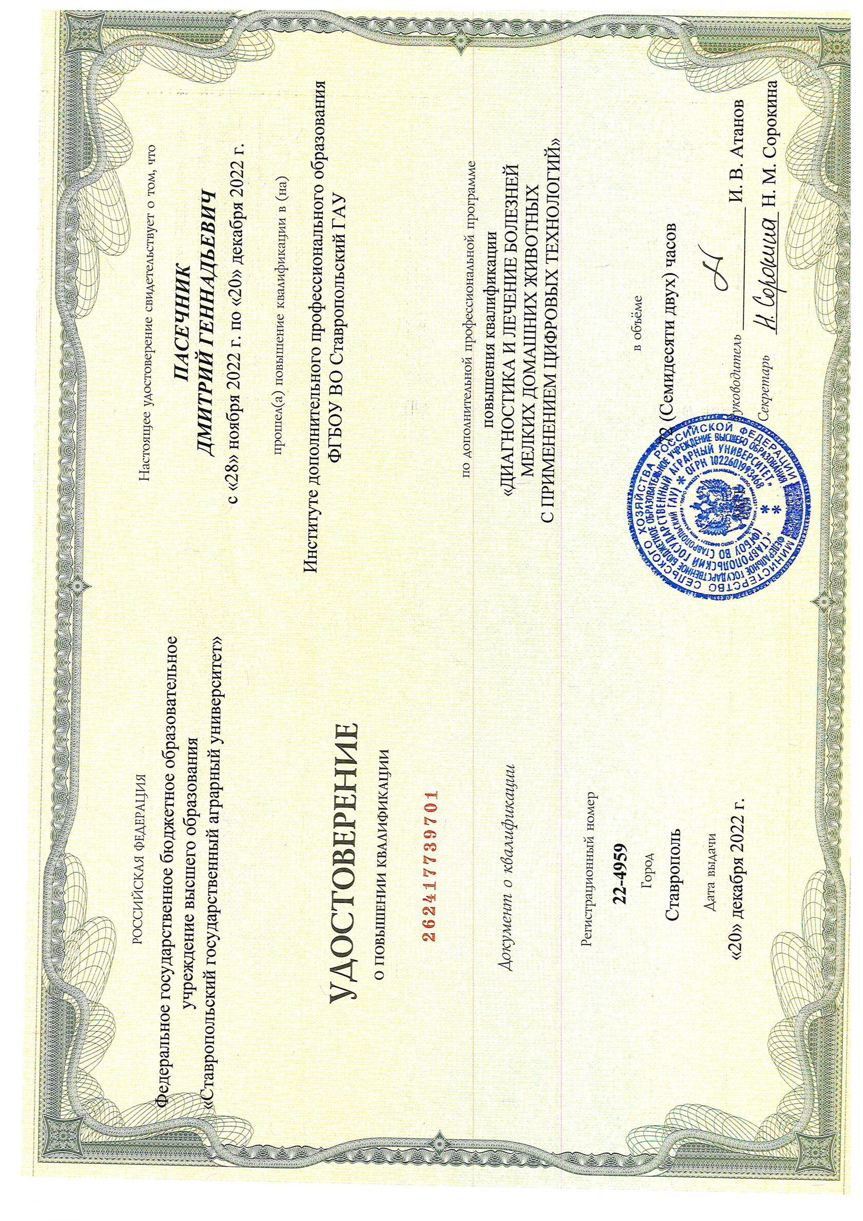 2022 г. - прошел повышение квалификации в Институте профессионального образования ФГБОУ ВО Ставропольский ГАУ на дополнительной профессиональной программе "Диагностика и лечение болезней мелких домашних животных с применением цифровых технологий".