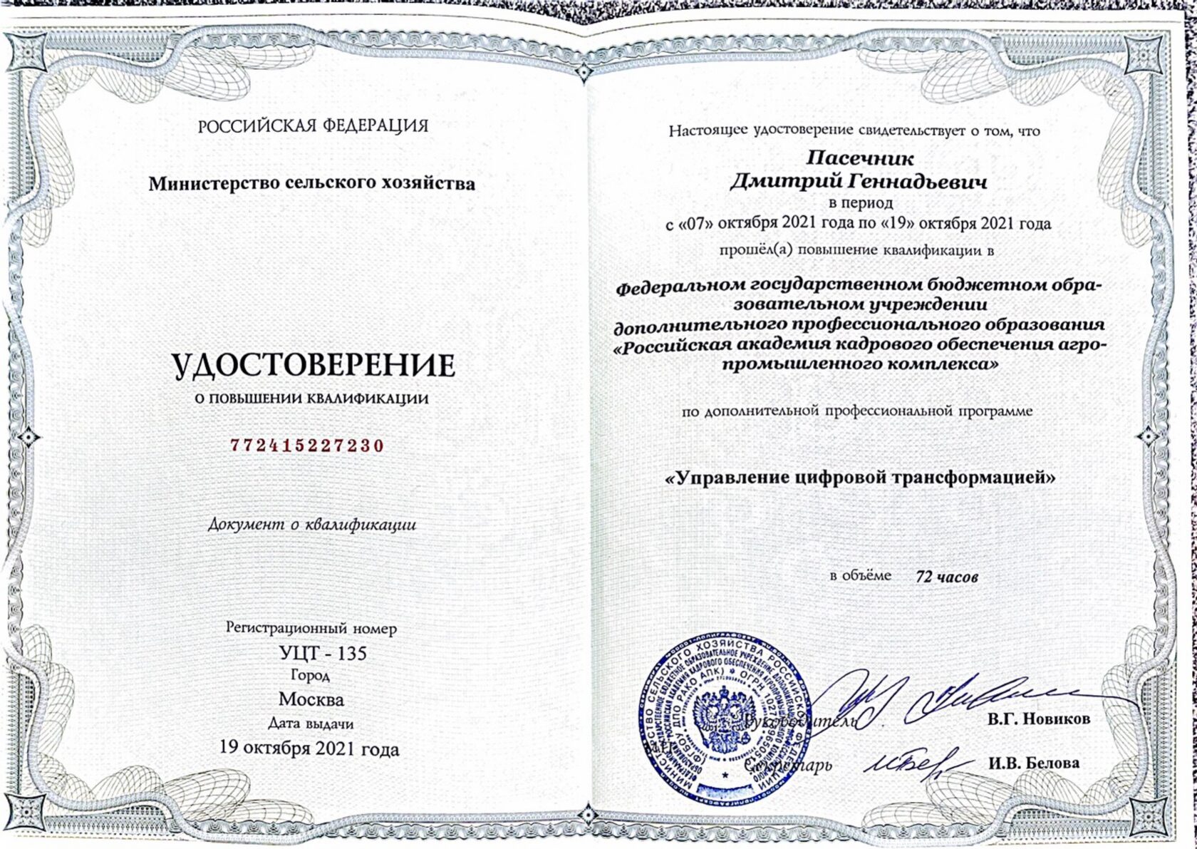 2021 г. - прошел повышение квалификации в ФГБОУ ДПО "Российская академия кадрового обеспечения агропромышленного комплекса" по дополнительной профессиональной программе "Управление цифровой трансформацией".